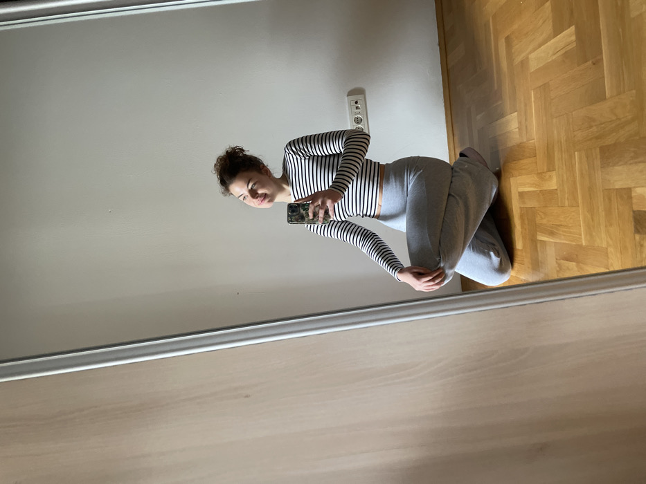 The image depicts an indoor scene in Boreti, Montenegro. A female individual is shown kneeling on a light brown parquet floor, arranged in a herringbone pattern. She wears a black and white horizontal-striped long-sleeved crop top, light grey loose-fitting pants, and light-colored footwear partially visible on her right foot. Her dark, curly hair is styled in an updo. The individual holds a smartphone with a dark, possibly patterned case in her right hand, aiming it towards her reflection in a large, floor-to-ceiling mirror positioned on the left side of the frame. Her gaze is directed upward and to the right. The background consists of a plain, light-colored wall. A white electrical outlet with multiple sockets is mounted horizontally on the wall to the right of the subject. The scene is illuminated by ambient natural light.