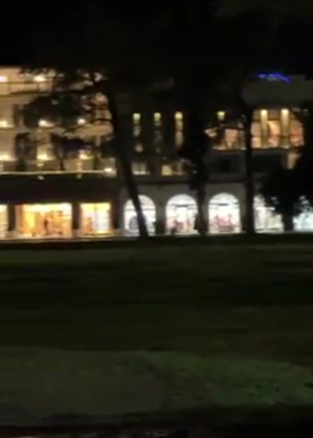 nighttime scene with a multi-story building in the background, likely a hotel or resort, featuring illuminated arched windows and upper-level lights