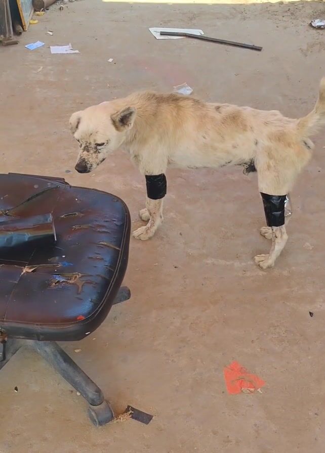 thin, light-colored dog standing on a concrete surface. The dog has black tape wrapped around both of its front legs, just below the knee. The dog appears to be in poor health, with visible ribs and patches of missing fur. Its face is dirty. The dog pants with its mouth open and looks towards the camera. Behind the dog is a black office chair. The surrounding area is cluttered with trash and miscellaneous items. In the background are a blue plastic stool and what looks like discarded furniture and building materials. The light suggests it is daytime.