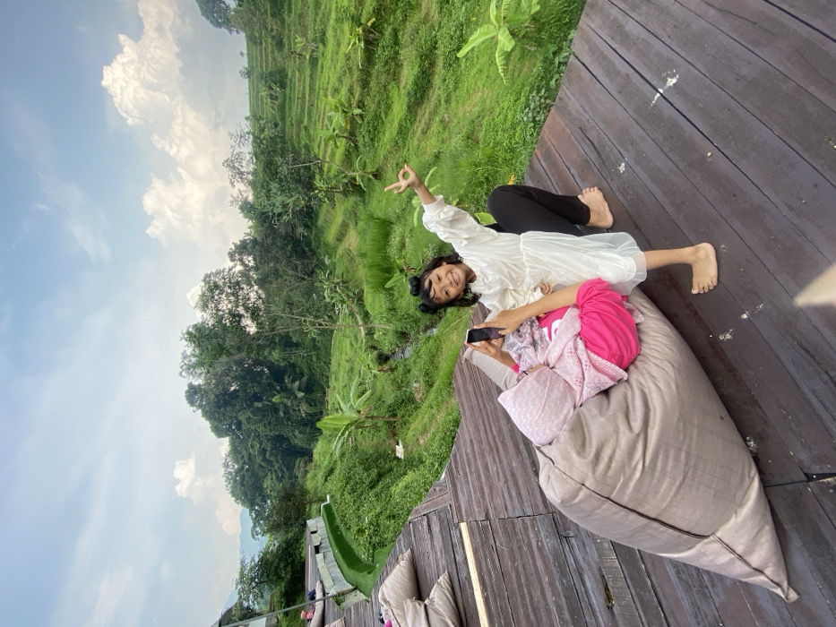 The image depicts an outdoor leisure area in Tamiajeng, Indonesia, featuring two individuals on a dark brown wooden deck overlooking terraced green fields. In the foreground, a young girl, approximately 5-8 years old, stands barefoot on the wooden planks, wearing a white long-sleeved dress and black pants. Her dark hair is styled in two buns. She smiles towards the camera with both hands raised, making an "okay" gesture with her right hand. To her left, an adult individual, likely female, is reclined on a large, light brown beanbag chair. This person wears a bright pink top and a light-colored, possibly patterned, hijab, and is holding a black smartphone with both hands, looking at its screen. Several other light brown beanbag chairs are visible along the curved edge of the wooden deck to the left. Beyond the deck, the scene transitions into a lush, vibrant green landscape characterized by numerous terraced fields on sloping terrain. Scattered banana trees and other tropical foliage are interspersed throughout the fields. A narrow stream or irrigation channel runs through the lower portion of the terraced area. In the background, dense green trees line the horizon, with distant mountains faintly visible on the far left. The sky is light blue with scattered white cumulus clouds, indicating daylight conditions.