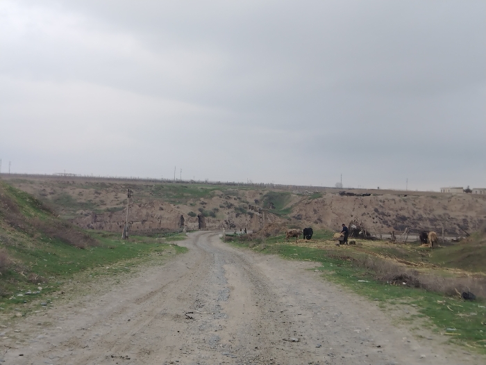 A dirt road leads through a rural landscape. Eroded hills line the sides, sparse green vegetation covering the slopes. A man feeds cattle next to a makeshift fence. Ruins or shelters appear embedded in the hillside beyond the road. A cloudy sky dominates the scene, casting a muted light over the desolate environment. Faint structures are visible in the distance.