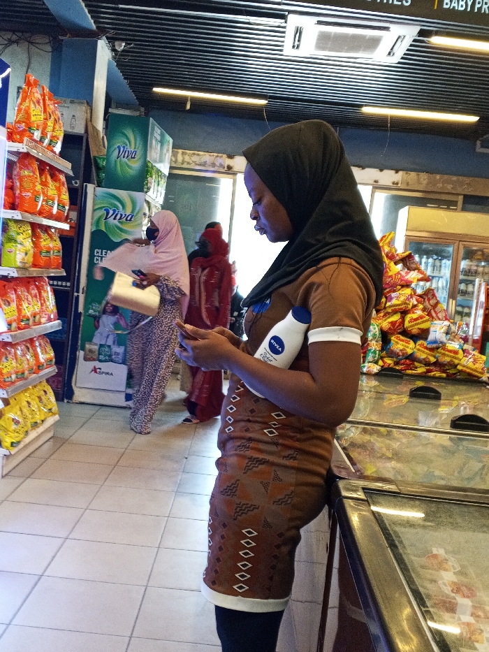 An indoor scene within a supermarket or grocery store in Tarauni, Nigeria, features three individuals. In the foreground, positioned to the right, a dark-skinned woman wears a black hijab, a brown short-sleeved dress with white and brown geometric patterns, and black leggings. She holds a white Nivea lotion bottle tucked under her left arm and is looking down at a smartphone held in both hands. Her left side rests against a refrigerated display case containing packaged goods. In the midground, to the left, another woman with a light pink hijab and a patterned dress (leopard print) holds a light-colored handbag and possibly a phone, her face partially obscured by a dark mask. Behind her, a third individual, mostly obscured, wears a dark red garment. The store environment includes multiple product displays. To the left, shelves are stocked with numerous orange and yellow packaged goods. A tall white display refrigerator featuring "Viva" branding and an "Aspira" logo is visible. To the right, behind the primary subject, another refrigerated unit is visible, with a large pile of yellow-packaged items (chips or snacks) stacked in front of it. The ceiling is black and slatted, with recessed lighting and an air conditioning vent. The floor is covered with light-colored square tiles. A brightly lit doorway or passage is visible in the background, suggesting an exit or another section of the store.