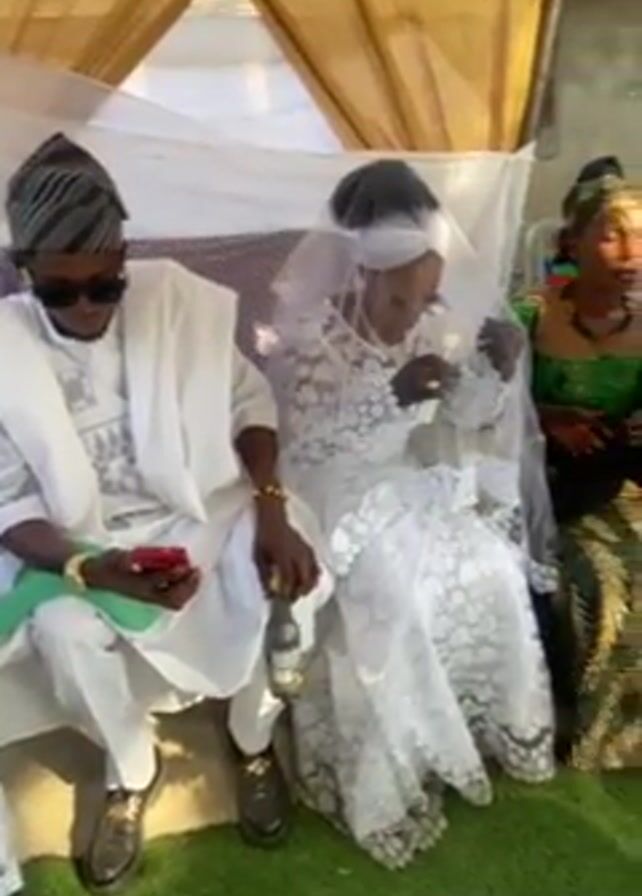 man and a woman dressed in wedding attire sitting next to each other. The man is wearing a white outfit, sunglasses, and a traditional hat. He is holding a cell phone to his ear and has a green sash and a bottle of beer in his lap. The woman is wearing a white lace dress and a veil, she appears to be fixing her veil. They are sitting on a white cushioned surface under a tent-like structure. A woman in a green outfit is visible to the right. The background suggests an outdoor event or celebration.