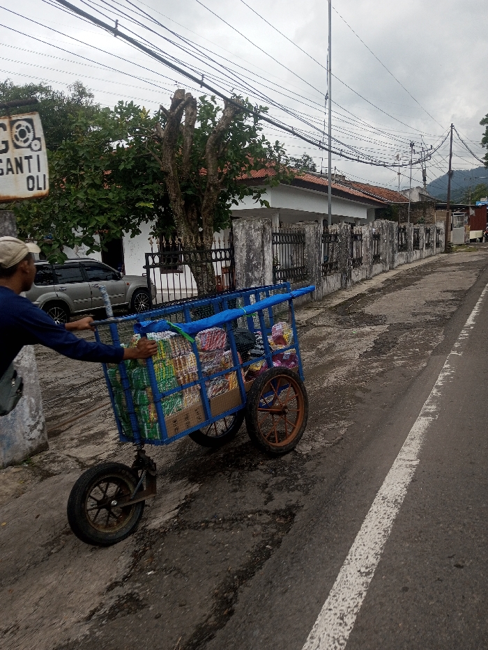 A street vendor pushes a blue cart filled with snacks along a cracked asphalt road with a painted white line. A man in a cap pulls the cart, his back to the viewer. Behind them, a gray SUV sits parked near a building with a red tile roof and a wrought iron fence. Overhead, power lines crisscross against a cloudy sky. A sign partially visible reads "GANTI OLI." A mountain is visible in the distance.