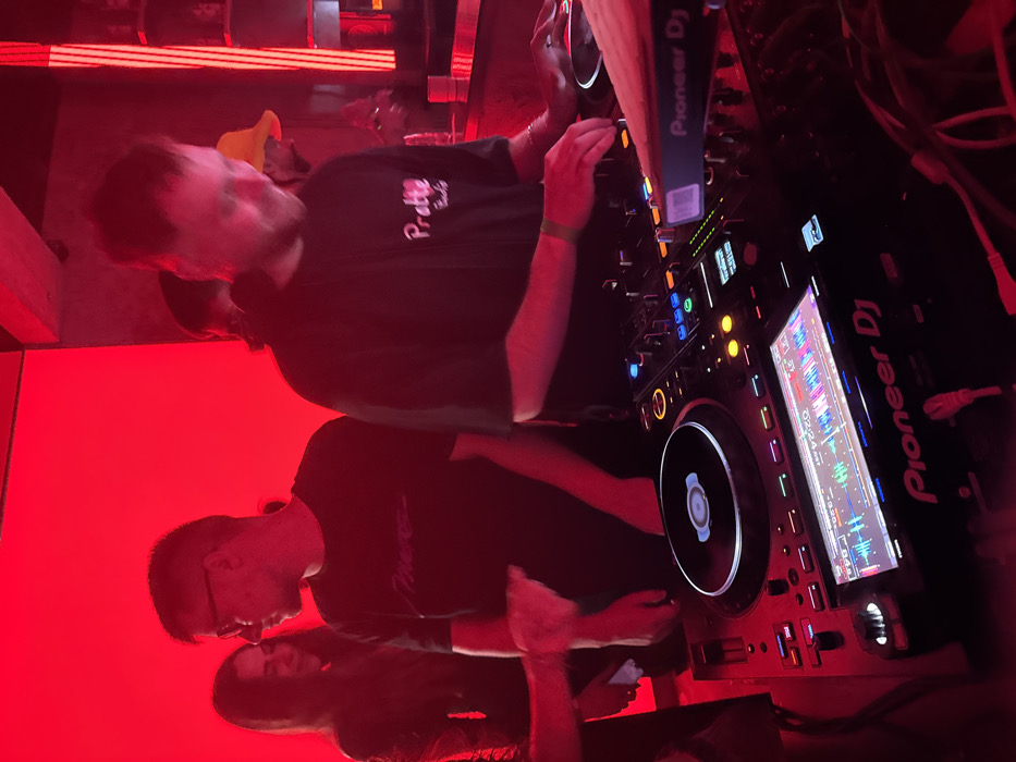 The scene depicts an indoor environment, likely a nightclub or bar, situated in Sofia, Bulgaria, saturated with intense red ambient lighting. In the foreground, a professional DJ setup is present, consisting of two Pioneer DJ CDJ players and a Pioneer DJ mixer. A male individual, positioned center-right, serves as the DJ, wearing a dark t-shirt with a light-colored graphic and a green wristband on his right arm. His hands are actively manipulating the controls of the mixer and CDJ. To the DJ's left, another male wearing glasses and a dark t-shirt stands, oriented towards the left. A female with long dark hair and a dark top is partially visible to the left of the second male, her right hand extending into the lower-left foreground, holding a white object near the DJ equipment. Additional individuals are partially visible in the background, including one person wearing a yellow bucket hat. A bar counter, displaying various bottles and glasses, is visible along the rear wall, accented by vertical red LED light strips. The specific venue within Sofia, Bulgaria, cannot be determined from the provided image.