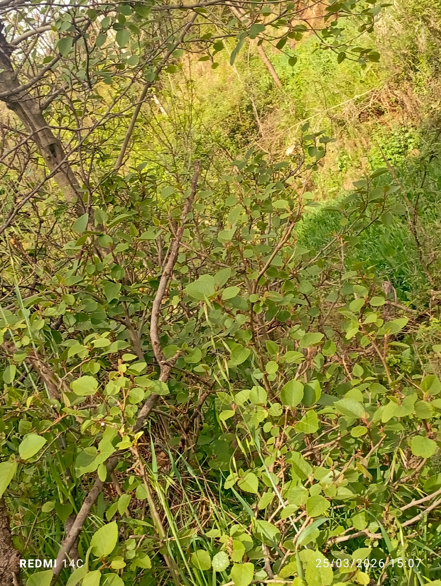 The image displays a dense, verdant natural environment, purportedly located in Grhala, Pakistan. The scene is dominated by numerous green-leafed bushes and intertwined brown branches occupying the foreground and midground. Behind this dense foliage, a lighter green area, possibly a grassy slope or more distant vegetation, is visible, illuminated by what appears to be natural sunlight from an overcast or filtered source, suggesting daytime. No individuals or man-made objects are present. The overall impression is an uncultivated, wild, or overgrown area of deciduous or semi-deciduous plant life. A "REDMI 14C" watermark is visible in the bottom left corner, and a timestamp "25/03/2026 15:07" appears in the bottom right corner.