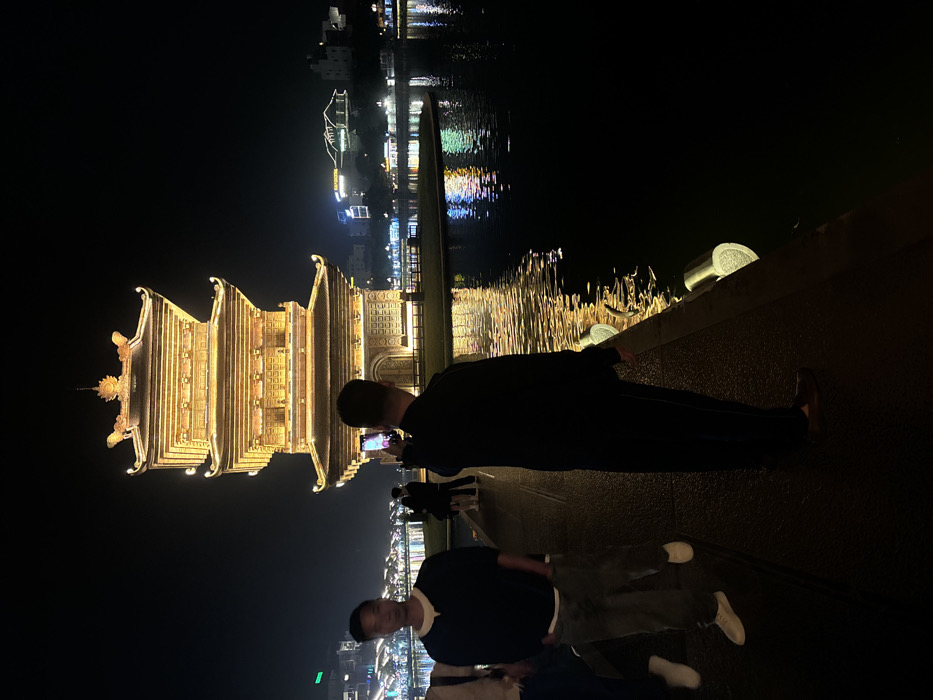 A nighttime outdoor scene shows a lit pagoda near a body of water reflecting city lights. Two people stand nearby, one taking a photo of the pagoda. The foreground is dark, with some light fixtures along the water's edge. The overall image has a strong contrast between the bright pagoda and the dark surroundings.