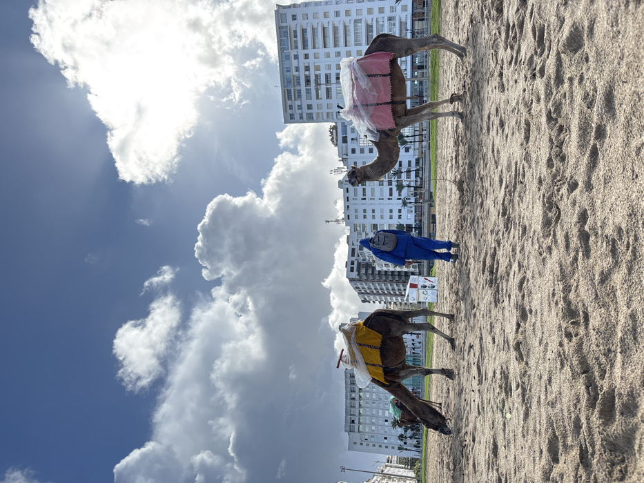 The image depicts a beach scene in Tangier, Morocco, under a partially cloudy sky. In the foreground, a sandy beach occupies the lower third of the frame, showing light brown sand with visible ripples and depressions. Two dromedary camels are present in the midground. The camel on the left is brown, positioned with its head lowered towards the sand, equipped with a yellow saddle blanket and a white plastic-covered saddle from which a red handle protrudes. The camel on the right, also brown, stands upright and faces right, outfitted with a pink saddle blanket covered by white plastic; a thin rope extends from its front leg into the sand. Between the two camels, a human figure walks away from the viewer, dressed in a blue hooded tracksuit with the hood up and wearing a backpack. To the left of the person, a white rectangular stand or sign with multiple graphics is visible on the sand. The background features a multi-story urban environment composed of several light-colored buildings, interspersed with palm trees and streetlights, indicative of a city promenade or beachfront. The sky above is characterized by large white and grey cumulus clouds, with sunlight strongly illuminating the upper right portion of the scene, breaking through the clouds.