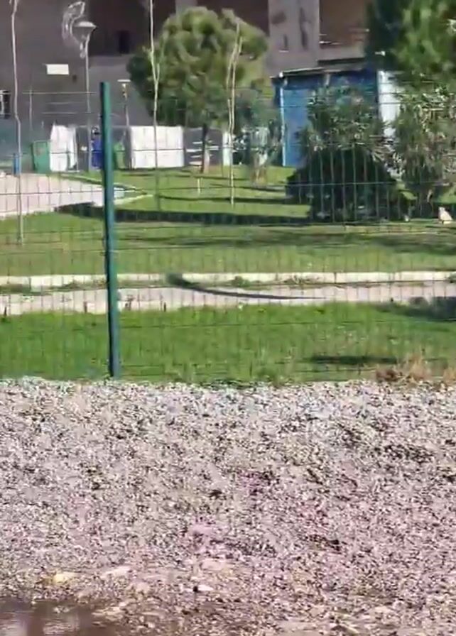 n outdoor scene. The foreground consists of a gravelly area, with a puddle reflecting the sky. Behind this area, there is a green chain-link fence. Beyond the fence is a grassy area with some trees and bushes. In the background, there is a tall building under construction. A small, white and brown dog wearing a leopard-print coat trots across the gravel. A larger, black and brown dog then walks into the frame, moving in the same direction.