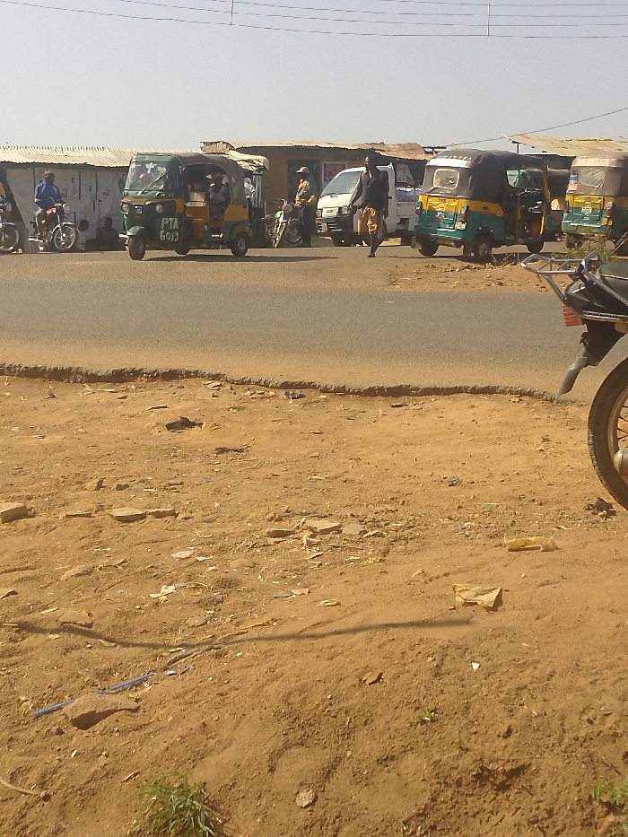 This image depicts a daytime street scene in Reifild-Ist, Nigeria. The foreground consists of uneven, reddish-brown dirt ground, littered with small stones, pieces of plastic, and crumpled paper, with minimal patches of green vegetation. The rear wheel and a chrome rack of a black motorcycle are visible on the far right. An asphalt road, appearing worn, traverses the midground. On this road, a green and yellow three-wheeled auto-rickshaw, bearing the inscription "PTA GOLD 601J," is centrally positioned, with occupants visible inside. To its right, a white van or small truck is stationary, flanked by at least two other green and yellow three-wheeled auto-rickshaws. Several individuals are present: a person in a dark shirt and light-colored trousers walks from right to left across the road near the white van. Another individual, wearing a yellow shirt and cap, stands beside a motorcycle parked near the white van. On the far left, a person in a blue shirt is seated on a white motorcycle. The background features a row of low-rise structures with corrugated metal roofs, indicative of commercial establishments or stalls. Overhead, multiple power lines are visible against a clear, hazy sky. The scene is illuminated by strong direct sunlight.