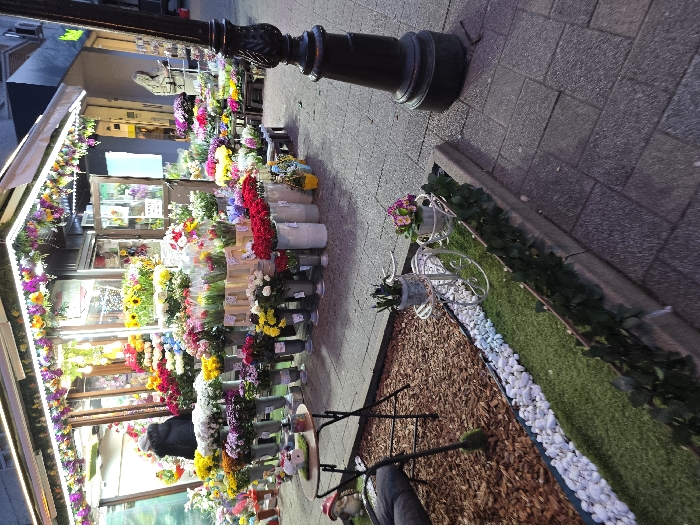 An evening photograph captures a vibrant flower shop located on a paved sidewalk in Stara Zagora, Bulgaria