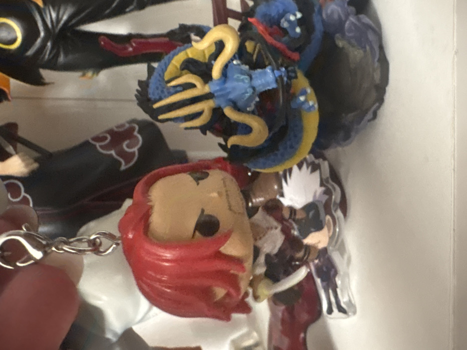 The scene displays a close-up, indoor view of anime collectible figures positioned on a white surface, likely a shelf. In the upper left, a human hand holds a silver lobster clasp attached to a metal chain, from which hangs a stylized keychain figure of "Shanks" from One Piece. This figure features red hair, light skin, a stern expression, and is dressed in a white shirt with brown accents, brown pants, and black boots, holding a small silver sword. It stands on a clear acrylic base with a graphic print. To the right of the "Shanks" figure, a blue and yellow dragon figure, resembling "Kaido" from One Piece, is situated. This figure is coiled, has golden horns and whiskers, and rests on a dark, irregularly shaped base. The background is blurred, showing other figures, including one with dark clothing bearing red cloud motifs (suggesting Akatsuki from Naruto) and another with black attire accented with yellow elements. The image provides no visual context or landmarks to determine a specific geographical location within Plovdiv, Bulgaria.