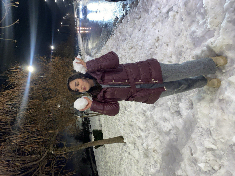 A young woman stands in the snow at night, holding two snowballs. She wears a maroon puffer jacket, gray pants, and tan boots. A tree with bare branches is to her left. In the background, there's a wet road reflecting light from street lamps and car headlights. The ground is covered in a thick layer of snow. The woman is looking at the camera with puckered lips, playfully posing with the snowballs.