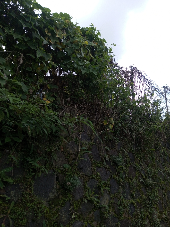 This scene is located in Vieng Phouka, Laos. The image depicts an upward-angled view of a stone wall, predominantly dark gray and textured, heavily colonized by green moss, small plants, and ferns. Above the stone wall, a dense layer of overgrown vegetation, consisting of large-leafed vines and intertwined dry branches, partially obscures a metal chain-link fence. A coil of barbed or razor wire is affixed along the top edge of the visible chain-link fence, extending across the upper right quadrant of the frame. The sky, a uniform bright white, dominates the background above the vegetation and fence. No individuals or specific activities are present in the depicted environment.