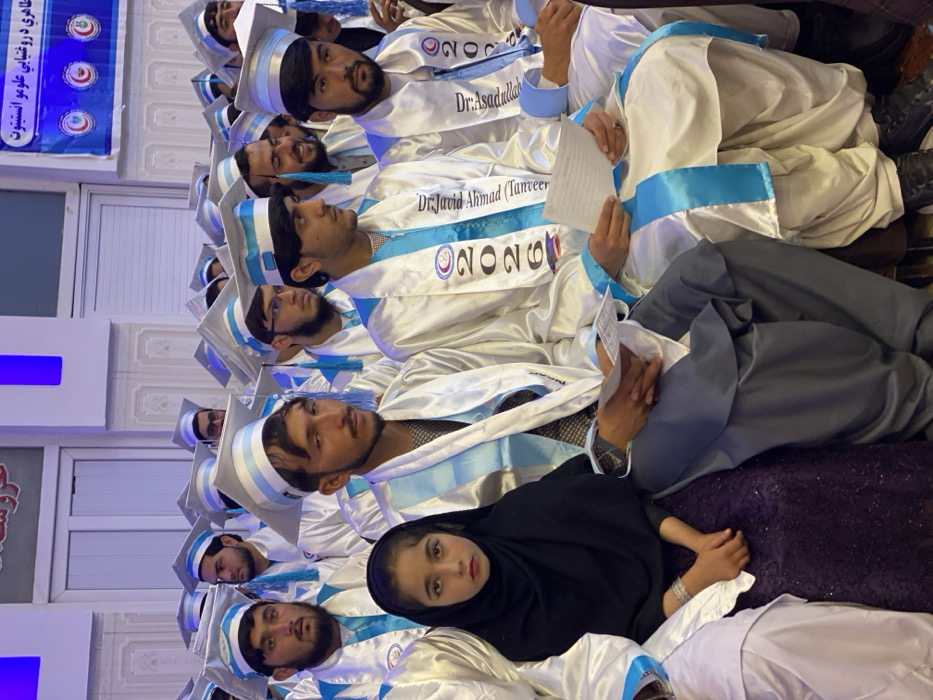 A gathering of individuals in graduation attire, including white gowns and caps with blue accents, are seated indoors. The robes are adorned with "2026" and names like "Dr. Asadullah" and "Dr. Javid Ahmad (Tanveer)." A young girl in a black headscarf is seated amongst them. A banner with text and medical-related symbols is partially visible in the background, reading "طاهري د روغتيايي علومو انستيتوت". The orientation of the image is tilted.