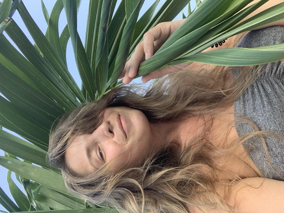 A female subject is depicted in a medium close-up, positioned outdoors in Nha Trang, Vietnam. She has long, wavy light-brown hair, some strands partially obscuring her left eye, and fair skin with slight redness on the cheeks. She is wearing a grey, strapless, ruched garment. Her right eye is partially closed, and her lips form a subtle smile, directed towards the viewer. Her left hand, visible on the right side of the frame, holds a broad green palm frond. A small black tattoo is discernible on her inner left forearm. The palm frond extends behind and above her head, occupying a significant portion of the background, with a clear light blue sky visible beyond the foliage.