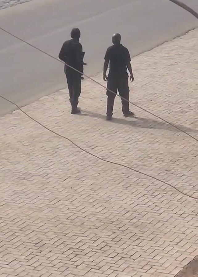 Two individuals, dressed in dark clothing, are walking on a light-colored brick sidewalk. One of the figures appears to be carrying a long object, possibly a rifle, on their left shoulder. The street behind them includes parked cars and a three-wheeled vehicle known as an auto rickshaw. Overhead, there are a few electrical wires. The general lighting suggests a daytime setting. The angle of the shot indicates it was taken from an elevated position, likely from a building overlooking the street.