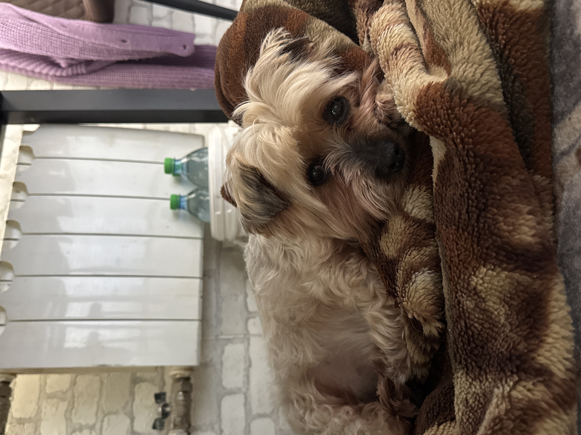 An indoor scene in Dmitrov, Russia, features a small dog with light brown and blonde fur, consistent with a Yorkshire Terrier, lying on a patterned brown and beige plush blanket in the foreground. The dog is resting its head on its paws, with open eyes directed forward. The background consists of a white brick-patterned wall. A white multi-segment radiator is mounted on the wall, with visible plumbing pipes and valves below it. To the right of the radiator, two plastic bottles with green caps are present on a white surface. A black vertical support structure is visible next to the bottles. A light purple knitted garment hangs in the upper right background, partially obscuring a dark brown upholstered furniture piece.