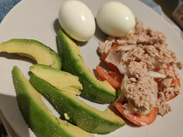 - "A white plate holds a meal of sliced avocado, hard-boiled eggs, and a tuna salad" by FM-ld1N03, licensed under CC BY 4.0