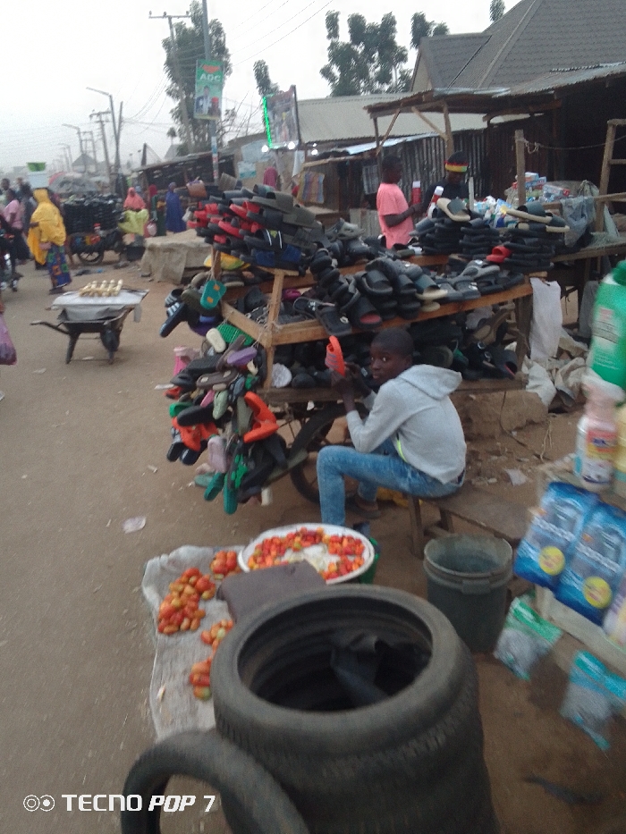 A bustling marketplace scene displays a young boy in a grey hoodie and jeans sitting amidst a shoe stall. The stall overflows with sandals and footwear, creating a stacked display. Nearby, tomatoes are laid out for sale. A tire and plastic containers are visible in the foreground. People and other market stalls fade into the background, suggesting a vibrant and active environment.
