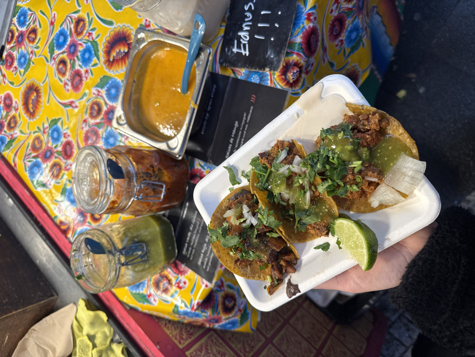 - "Three tacos with meat, cilantro, onions, green salsa, and a lime wedge are presented on a white plate" by FM-k63fK2, licensed under CC BY 4.0