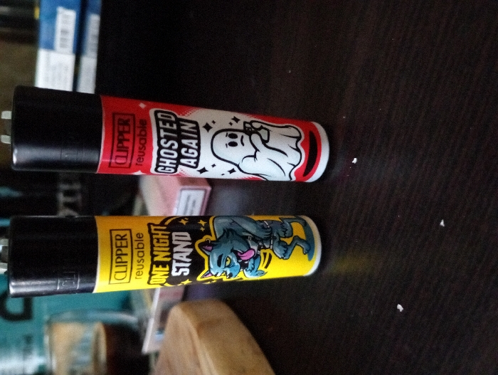 - "The image displays an indoor scene in Blagoevgrad, Bulgaria, focusing on two distinct Clipper brand reusable lighters positioned upright on a dark brown surface" by FM-M09Ti2, licensed under CC BY 4.0