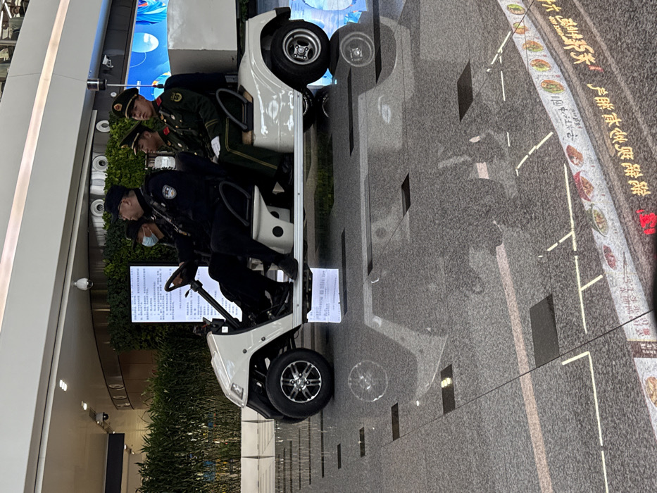 A white four-seater electric utility vehicle, resembling a golf cart, is stationary on a highly polished, grey speckled tile floor within a modern indoor facility in Langfang, China