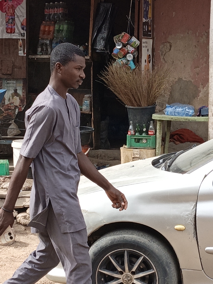 - "An outdoor scene in Gwagwarwa, Nigeria, depicts a dark-skinned adult male walking rightward in the foreground, wearing a grey short-sleeved tunic and matching trousers" by FM-cSMTg1, licensed under CC BY 4.0