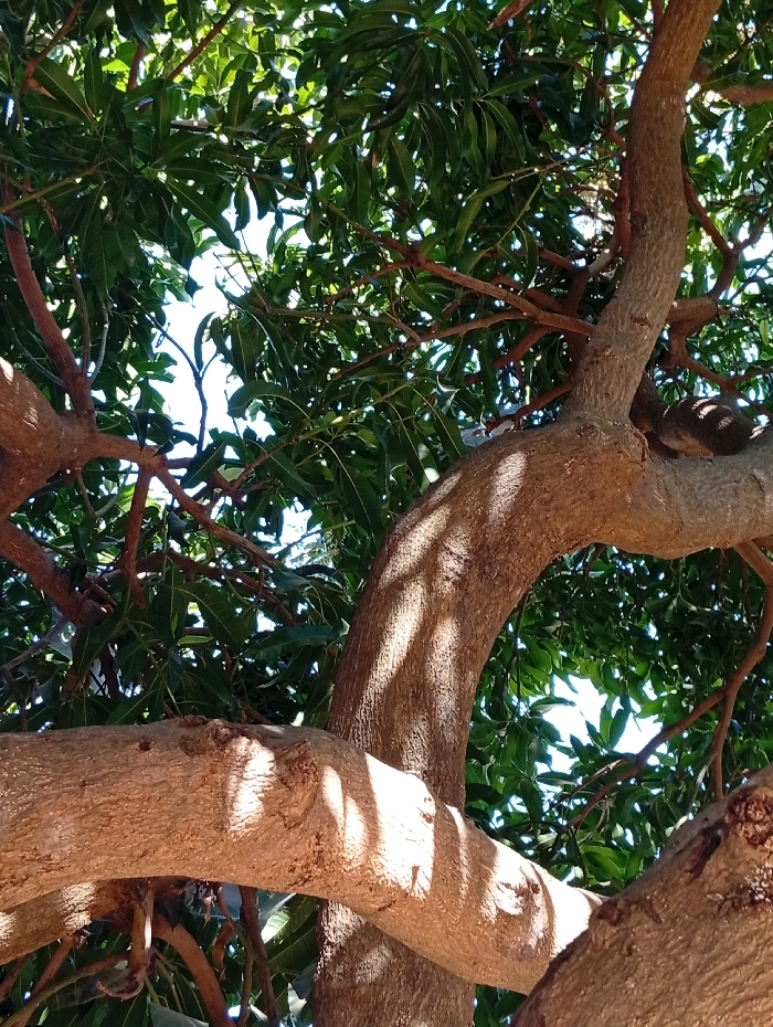 A dense tree canopy fills the frame. Brown, textured branches intertwine, creating curving lines and patterns. Patches of sunlight and shadow stripe the branches. Green leaves provide a backdrop, with glimpses of a bright sky visible through the foliage. The overall impression is one of natural complexity and vibrant greenery.