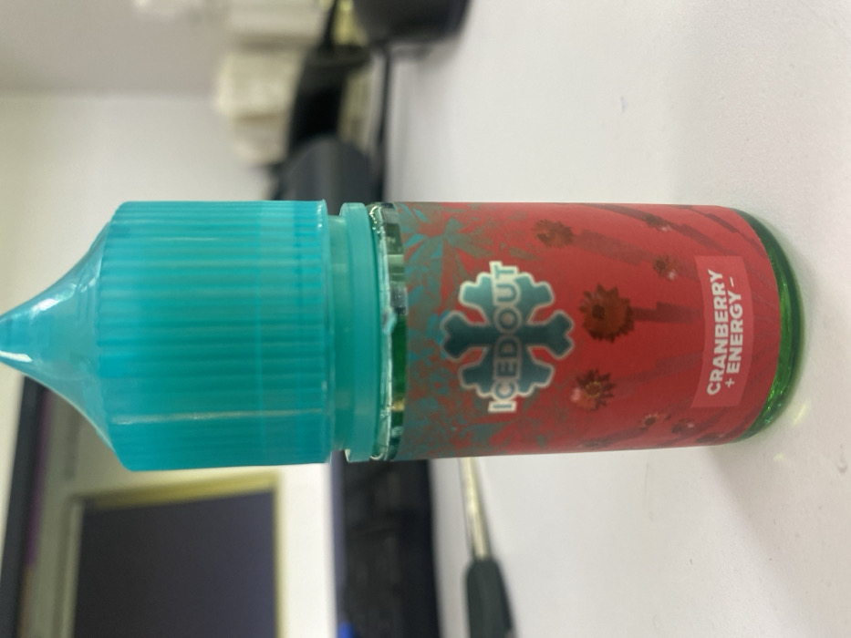 A clear glass bottle with a teal plastic cap and a red label stands upright on a white surface in the city of Chaikovsky, Russia. The label features "ICEDOUT" in white within a teal snowflake design, and "CRANBERRY + ENERGY -" in white text on a red rectangular background at the bottom. Stylized reddish-bronze patterns are present on the label. The liquid inside the bottle appears green. The background is out of focus, revealing a laptop with a dark screen and keyboard on the left, alongside a dark-handled implement. To the right, indistinct office items and a white wall are visible.