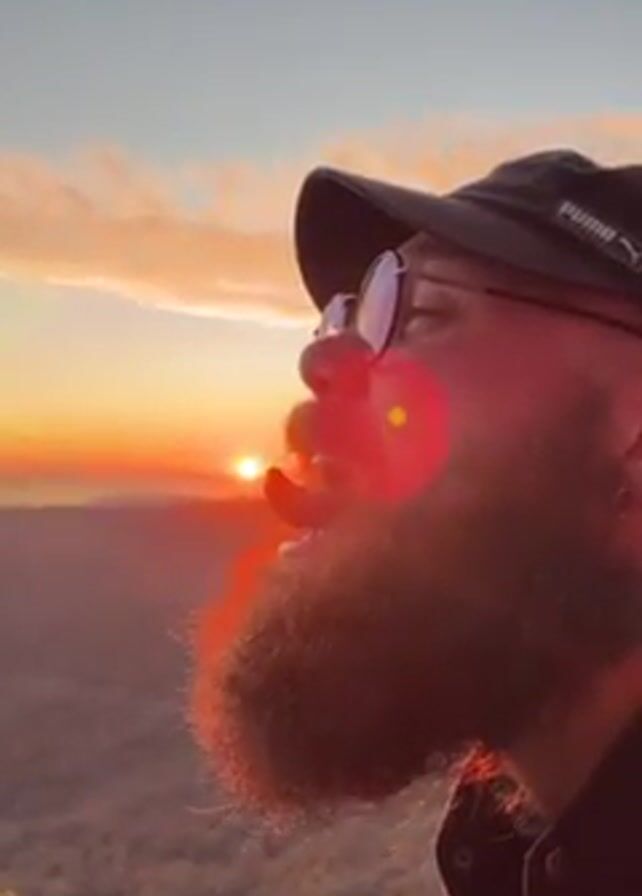 A person with a beard, glasses, and a Puma baseball cap stands outdoors with their head tilted back, tongue extended to seemingly “lick” the setting sun