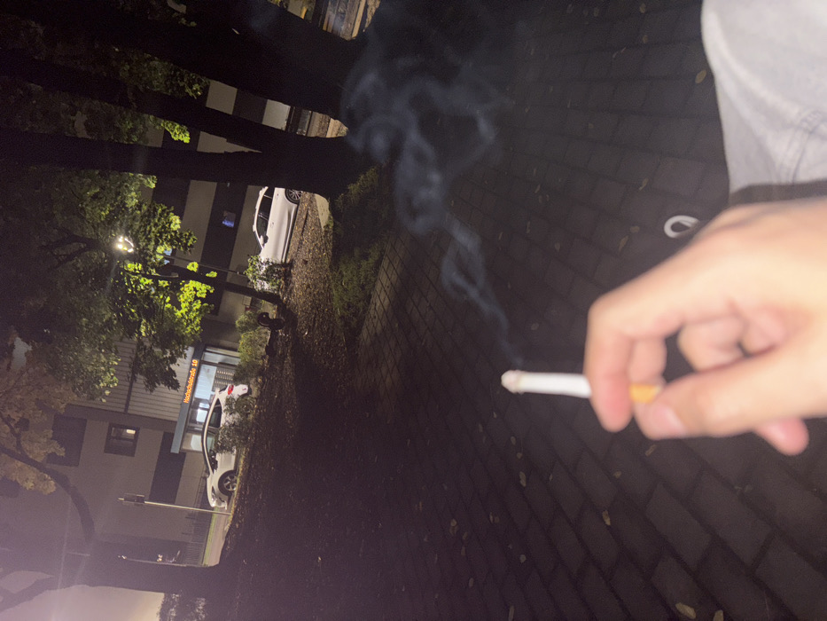 A nighttime scene depicts a first-person perspective on a paved pathway at Hochschulstraße 10, Unknown, Germany. In the immediate foreground, a fair-skinned hand holds a lit cigarette with a white body and an orange filter; smoke plumes upwards and to the right from the burning tip. The lower right corner shows a portion of light-colored trousers belonging to the individual holding the cigarette. The pathway consists of dark, rectangular interlocking bricks. Beyond the foreground, the pathway continues, flanked on the left by an unpaved area with scattered leaves and sparse ground cover. To the right, several dark tree trunks with dense foliage are visible, some leaves illuminated by artificial light sources. In the background, a modern, multi-story building with a light-colored facade stands. Its main entrance features a glass awning and a sign with red text reading "Hochschulstraße 10." Two white passenger vehicles are parked in front of the building: a white SUV/crossover is positioned to the left of the entrance, and a white sedan is partially obscured by trees to the right. The scene is illuminated by streetlights and building lights, casting a dim, ambient glow.