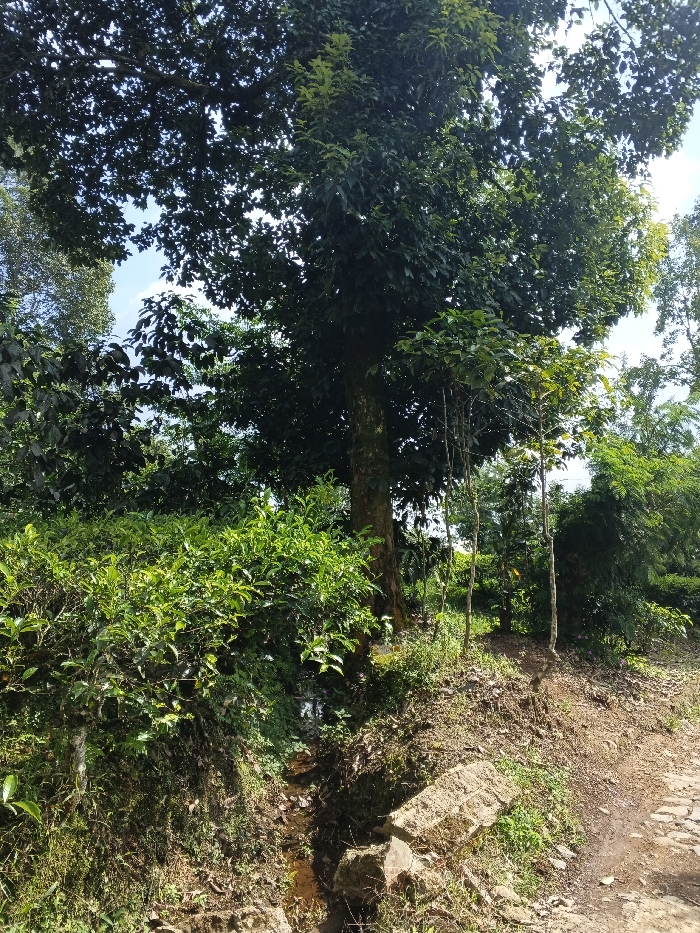 A large tree dominates the scene, its dense canopy casting shade over the area. Lush green foliage covers the foreground, including shrubbery and smaller plants. A narrow stream or ditch cuts through the landscape, with exposed soil and rocks visible along its banks. A rough path or road borders the area with the foliage. Sunlight filters through the trees in the upper portion of the image, creating a sense of depth.