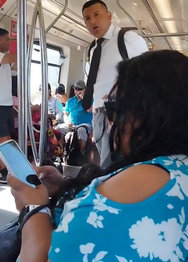 The video captures a scene inside a moving subway car. A person with dark hair wearing a blue floral shirt is seated, focused on their phone, while a person dressed in a white shirt and a black tie is standing and speaking to the other passengers. The speaker has a backpack over their shoulder and is holding a plastic bag in their hand. Several other people are seated or standing around them. The interior of the subway car is brightly lit and appears relatively clean.