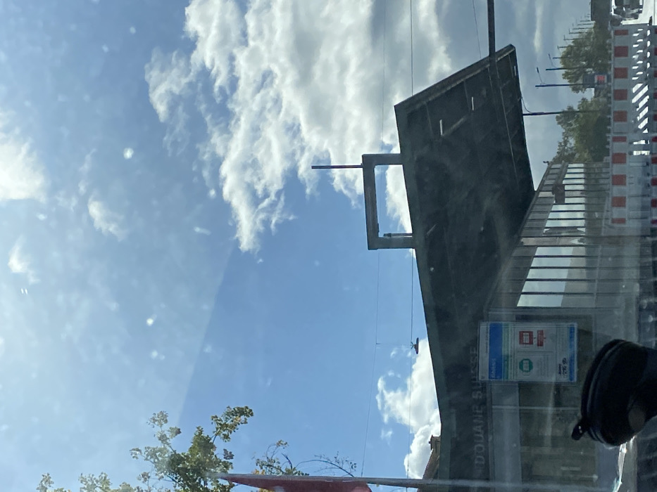An image captured from within a vehicle depicts a Swiss customs office under a clear blue sky with scattered white clouds