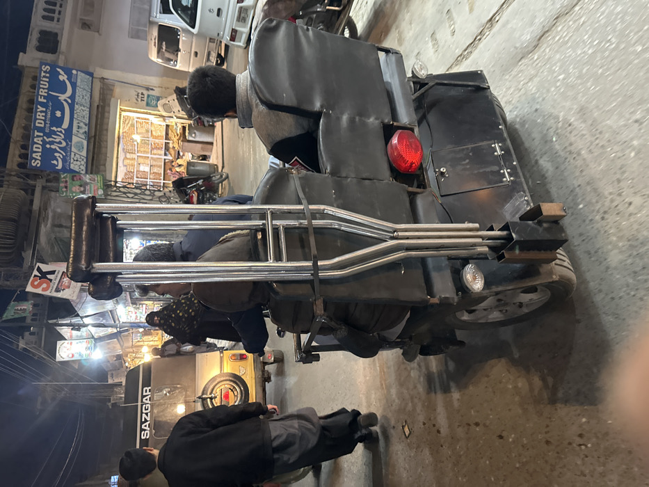 A black auto rickshaw is parked on a street with people nearby. It has a red taillight and silver bars attached to the back. In the background, there's a dry fruits shop with a lit-up sign. A vehicle is visible further back, and the street is illuminated by various lights.