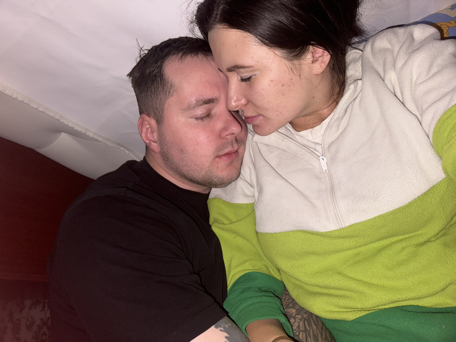 This image captures two individuals, one male and one female, in an intimate, resting position, presumably indoors in Красный Маяк, Russia