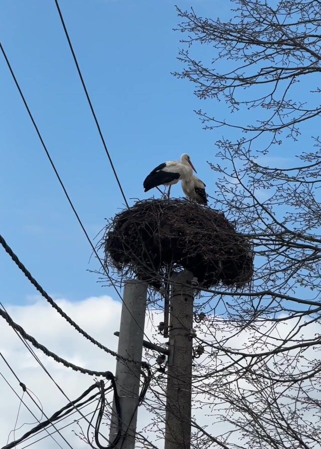 - "Two white storks with black wing feathers stand on a large nest atop a utility pole" by FM-7EcLC2, licensed under CC BY 4.0