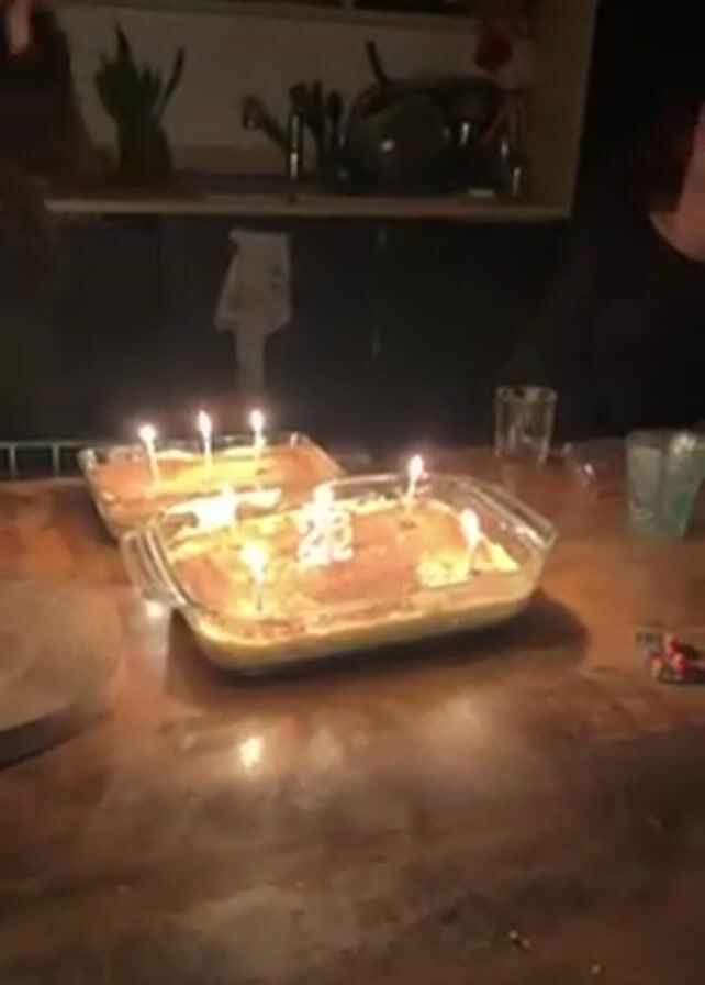 The scene is a birthday celebration with two glass dishes of what appears to be cake or bread pudding on a dark wooden table, each adorned with lit candles. The candles on one dish form the number 24. A few people are present, one of whom is visible on the left, and another woman with curly hair is seated to the right, smiling and gesturing as if speaking. Glasses, a bottle of juice, and a wooden coaster are also on the table. The background shows a shelf with various items and utensils. The overall lighting is low, with the candles providing the primary source of illumination.