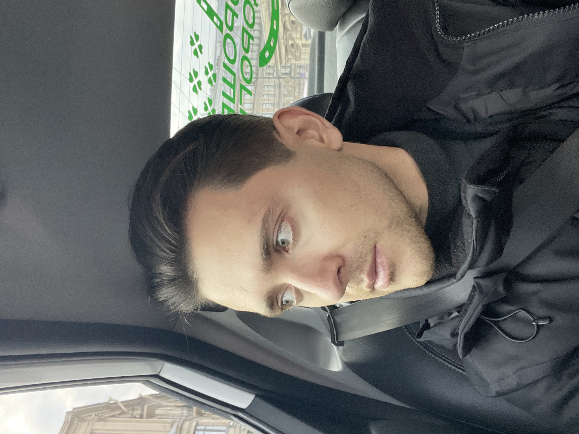 A man sits in the back seat of a car, wearing a black jacket and a seatbelt. Outside the window, buildings in Saint Petersburg, Russia, are visible, identified by the characteristic architecture and a sticker on the rear window that says "Obolon" in Russian and features cloverleaf shapes.