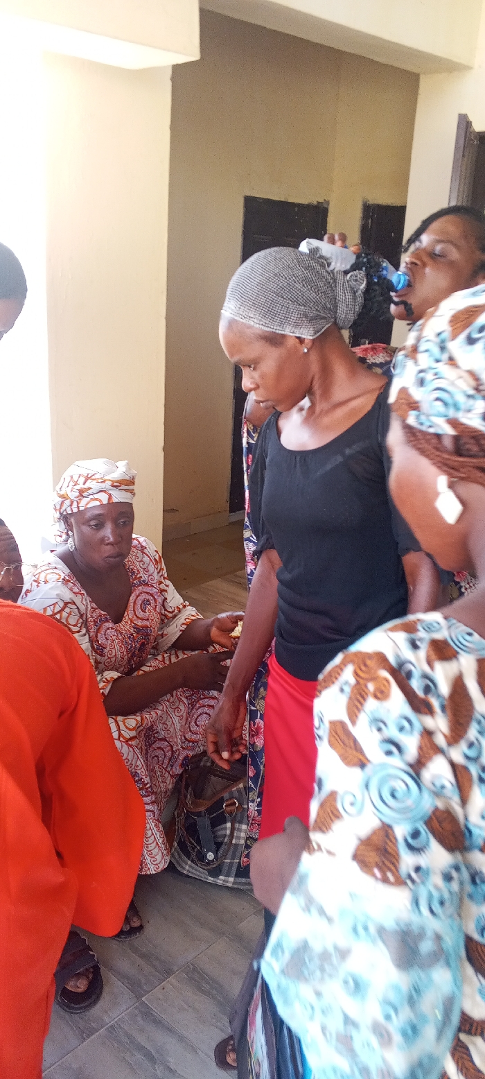 The image depicts an indoor scene within an unknown building, possibly a corridor or waiting area, in the city of Unknown, Unknown. The environment features light-colored cream or beige walls and a grey tiled floor. Natural light illuminates the area from the left side. At least five adult females are present. In the mid-ground, a woman is seated on the floor, wearing a white and orange patterned traditional headwrap and a matching dress. She holds a light-colored food item in her right hand and appears to be chewing. A dark handbag rests on the floor beside her. Standing slightly to her right, another woman wears a black long-sleeved top, a red skirt, and a grey patterned headwrap. She is looking downwards. To the far right, partially visible, a third woman wearing a patterned garment with blue and brown motifs is actively drinking from a blue plastic bottle. An adhesive white medical patch is visible on her right upper arm. Portions of other individuals are visible on the far left, wearing orange attire, and in the background, wearing a dark patterned dress. A dark doorway is visible in the background against the cream wall on the right.