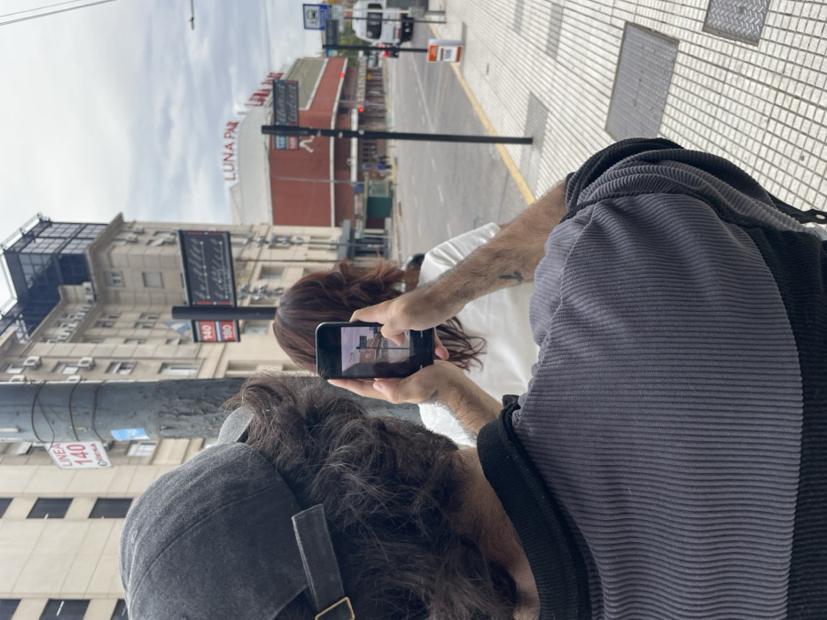 An individual, seen from behind, wearing a dark grey baseball cap and a grey corduroy jacket, holds a black smartphone horizontally with both hands, aiming it forward. This person has dark, wavy hair and a small cross-shaped tattoo on their right forearm. Ahead of this person, a second individual with reddish-brown hair and a white t-shirt stands, facing away from the camera. The scene depicts an urban environment in Buenos Aires, Argentina. A dark street pole stands prominently in the mid-ground, adorned with a white rectangular sign indicating "LINEA 140" and additional black and white signs with "140" and "180" in red, likely referencing bus routes. The foreground sidewalk is paved with grey and white checkered tiles, featuring metal grates. Across a wide asphalt street, defined by a yellow curb line, the distinct red facade of the "LUNA PARK" arena is visible, its name displayed in white capital letters. To the left of Luna Park, a multi-story, light-colored building with classical architectural elements and a modern dark glass structure on its rooftop dominates the left background. The sky is overcast. A white van and other distant vehicles are present on the street. The location is in the vicinity of the Luna Park arena, specifically in the San Nicolás neighborhood of Buenos Aires.