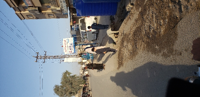 The image depicts a street scene in what is stated to be Nakhonay, Afghanistan, under clear daylight conditions. In the immediate foreground, a shadow of a person and a vehicle part (possibly a motorcycle handlebar) are cast on the asphalt road. The road surface transitions into a muddy, unpaved strip with a visible ditch or trench running parallel to it on the right side. Seven individuals are present. On the left side of the road, two adult males in dark shalwar kameez stand; one holds a dark object and looks towards the camera. Towards the right, an adult female in a light-colored abaya and an adult male are partially visible near a white van. In the center, two boys in dark shalwar kameez are visible, one walking towards the viewer. Another person, dressed in light clothing, is bent over, head down, appearing to interact with or examine the ditch on the right side of the road. Objects include a white passenger van parked on the right, and three large, blue plastic water tanks stacked on the far right. A prominent utility pole with multiple overhead power lines stands centrally. Behind it, a large billboard with text in an unidentifiable script and various images is visible. Buildings line both sides of the street, including a multi-story structure with balconies on the far right and smaller commercial buildings or residences on the left. A large tree is visible on the left side of the road. The sky is clear and blue.
