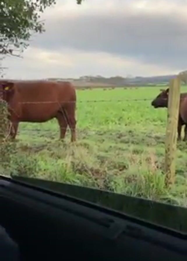 From inside a vehicle, the video shows two brown cows in a grassy field on a cloudy day