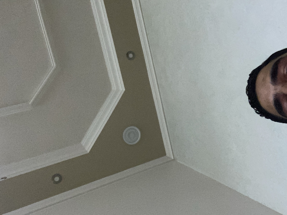 A partial view of a man's face, showing an eye, eyebrow, and hair, is situated in the upper right of the frame. The rest of the image is dominated by a ceiling with decorative molding. Three recessed lights are visible, spaced along a decorative, tiered border. The ceiling is predominantly white with sections painted in a light beige tone. The image is shot from a low angle, looking up.