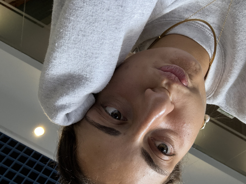The image displays a close-up of a woman's face, angled and slightly tilted. She has dark brown hair, dark eyebrows, and brown eyes, looking directly towards the camera. Her skin appears dewy. Her lips are slightly pursed in a pout. A light gray, possibly terry cloth or fleece, sweatshirt is drawn up, with a portion resting against the right side of her face, giving the appearance of her head being supported by an arm covered by the garment. She wears a silver-colored hoop earring on her visible left ear and two gold-colored necklaces: a thin herringbone chain and a longer, thinner chain with a small pendant. The background is out of focus, indicating an indoor setting. Visible in the upper left is a dark blue grid pattern, and in the upper right, a circular light fixture emits a warm glow. The specific location within Rishon LeZion, Israel, cannot be determined from the visual information provided.