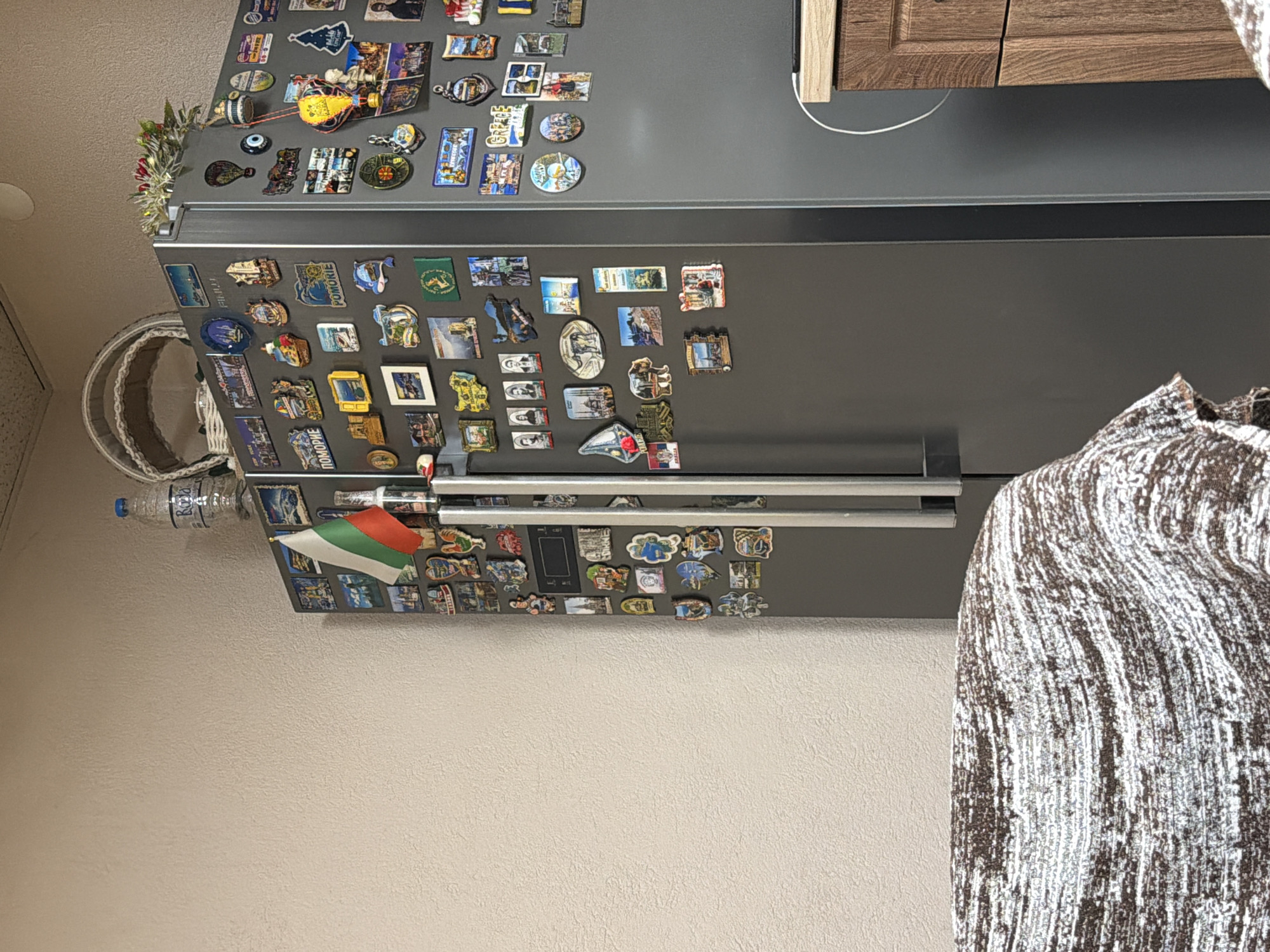 refrigerator covered in magnets. The refrigerator is gray and has two doors. There are magnets of various shapes and sizes attached to the doors. The wall behind the refrigerator is beige. There is a water bottle attached with a magnet to the refrigerator door. The flag of Bulgaria is attached to the refrigerator door with a magnet. The setting appears to be a domestic kitchen. Without further information, the precise location in Panagyurishte, Bulgaria, cannot be determined.