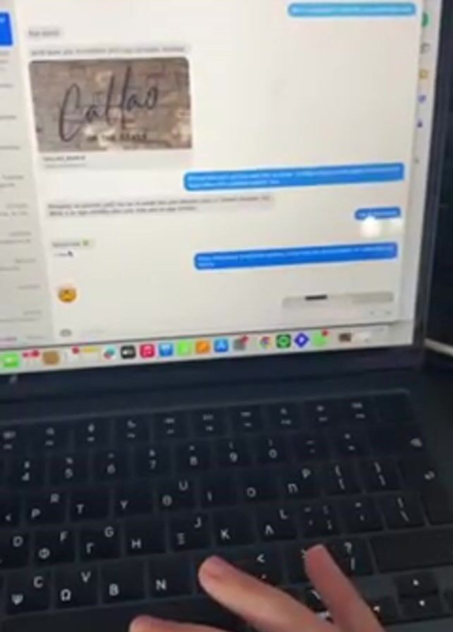 A hand with rings types on a laptop keyboard. The laptop screen displays a chat message thread with an image and various messages, primarily in what appears to be Greek and English. Upon entering the text "good luck", the screen rapidly fills with many instances of the phrase "good luck" accompanied by images of four-leaf clovers. The laptop is on a dark surface and other icons are visible on the taskbar.