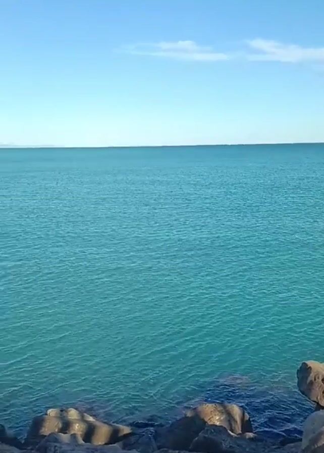 static shot of the ocean taken from a rocky shoreline. The water is a vivid turquoise blue, gently rippling, extending to a distant horizon where a faint landmass can be seen. The sky is a clear, bright blue with a few sparse, wispy clouds near the top of the frame. The foreground is filled with gray and brown rocks of various sizes, creating a natural barrier between the viewer and the water's edge.