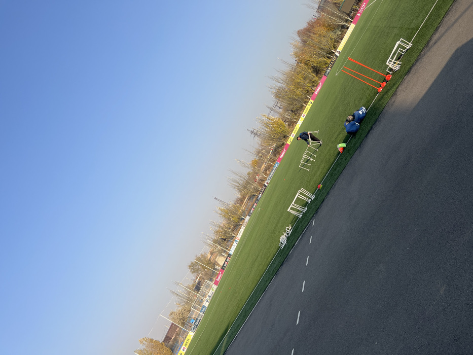 The image displays an outdoor sports complex in Charentsavan, Armenia, under a clear, bright blue sky during daylight. The foreground features a dark asphalt running track with white dashed lane markers. Adjacent to this track lies a green artificial turf sports field, delineated by white lines. Along the field's far sideline, a series of advertising banners are displayed, featuring logos such as "YO HEALTH," "ARAX," "FastTex," and "RARE." In the distant background to the left, white soccer goalposts with netting are visible, behind which are fences and indistinct buildings. A line of deciduous trees with autumn yellow-orange foliage, alongside some bare trees, extends across the middle-ground background, interspersed with industrial structures and overhead power lines. On the artificial turf, various pieces of training equipment are present. In the mid-ground, several white low hurdles (agility gates) are stacked, while another set is actively being manipulated. A male individual, dressed in a dark blue jacket and dark trousers, is observed in a bent posture, interacting with an arranged set of these white hurdles. Closer to the foreground track, slightly to the left of the male individual, a stack of blue sports bags is situated on the turf, next to a green cone and a yellow cone. Another individual, partially visible, is seated or kneeling on the turf near these bags, wearing a blue top, with only their back and head discernible. To the right of the field, a cluster of orange vertical training poles and small orange disc cones are positioned, alongside additional white low hurdles.